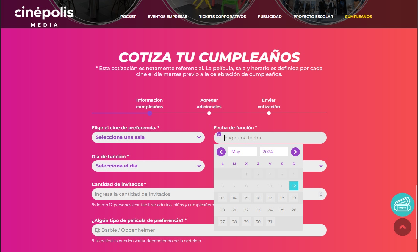 Moderno, llamativo y atractivo para una sucursal de Cinepolis en Chile, con cartelera de películas y promociones para eventos y negocios.