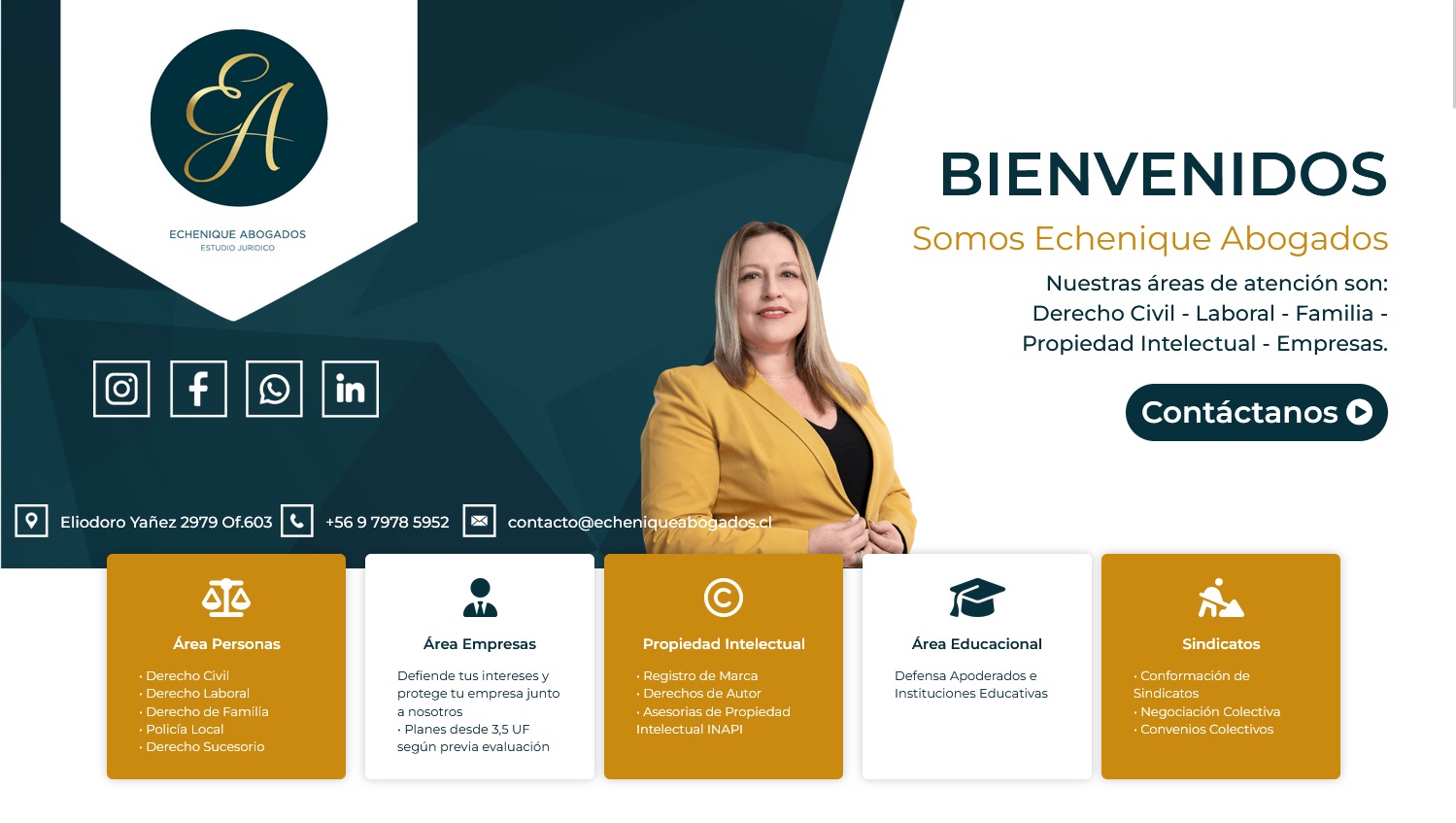 Sitio de una sola página con elementos de diseño personalizados y visuales atractivos, diseñado para un bufete de abogados, que muestra sus servicios de manera efectiva.